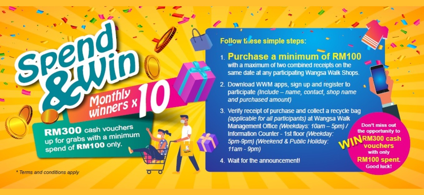 Spend a minimum RM100.00 (in a maximum of two combined receipts) on the same day at any participating Wangsa Walk Mall Shops to stand a chance to win a Cash Voucher worth RM300.00. Wangsa Walk Mall Management will randomly select 10 monthly lucky winners.