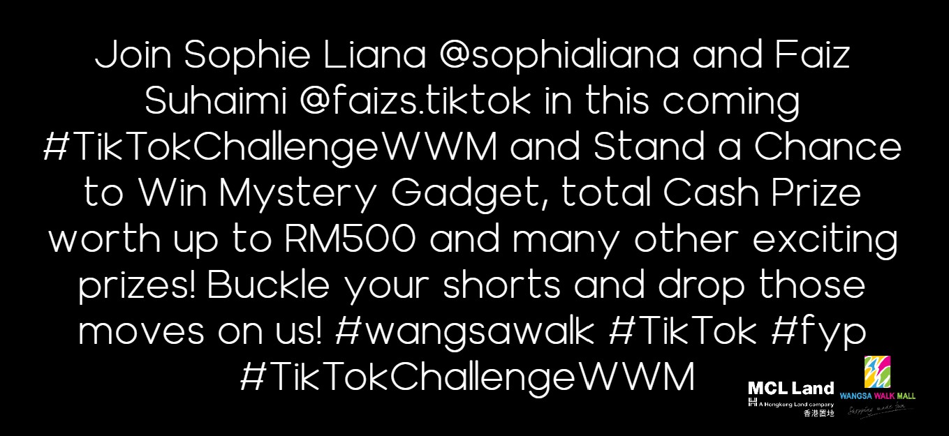 Join Sophie Liana @sophialiana and Faiz Suhaimi @faizs.tiktok in this coming #TikTokChallengeWWM and Stand a Chance to Win Mystery Gadget, total Cash Prize worth up to RM500 and many other exciting prizes! Buckle your shorts and drop those moves on us! #wangsawalk #TikTok #fyp #TikTokChallengeWWM Terms and Conditions: https://bit.ly/tiktokchallengewwm